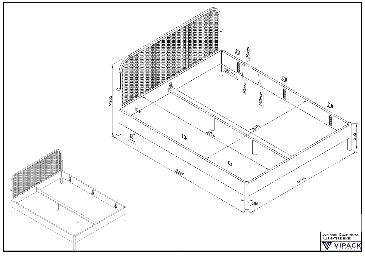 Das Rattan-Kopfteil hat eine Füllung im Stil des Wiener Geflechts.