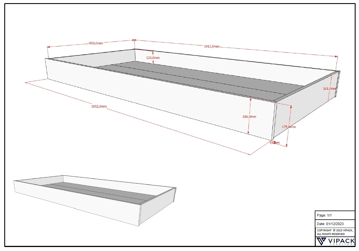 Stellfläche Bettschublade ca.: B: 195,2 x H: 17,5 x T: 94 cm.