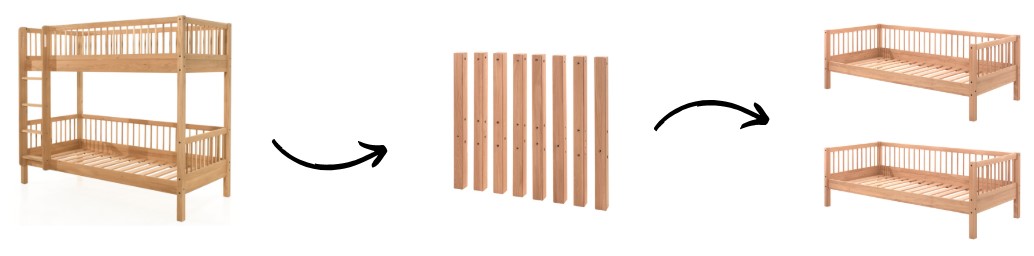 zusätzlich geteilte Bettpfosten zum Zurückbau in Einzelbetten
