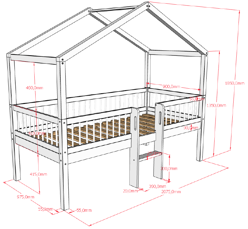 FORREST Buche - halbhohes Hausbett inkl. Dachaufbau, mit einer Liegefläche von 90 x 200 cm und gerader Leiter in der Mitte, ideal zum Spielen und Schlafen.