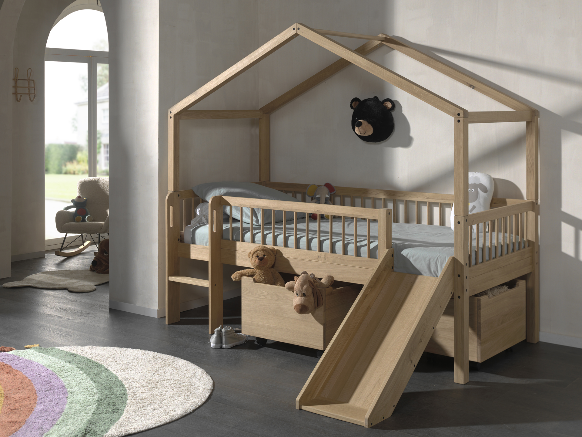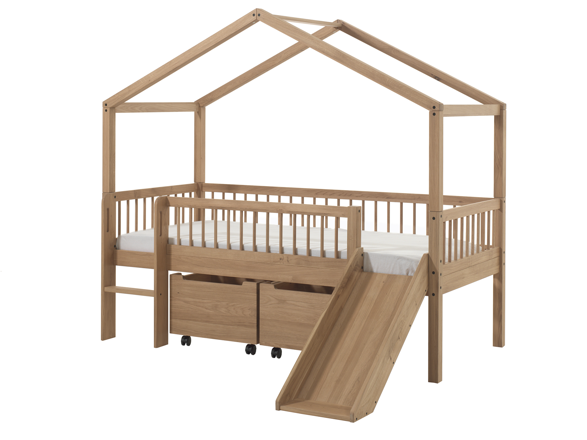 FORREST Eiche - Set best. aus halbhohem Hausbett inkl. Dachaufbau und Rollboxen.