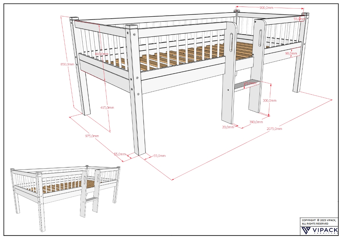 Benötigte Stellfläche Junior-Spielbett ca. B: 207,5 x H: 85 x T: 107 cm.