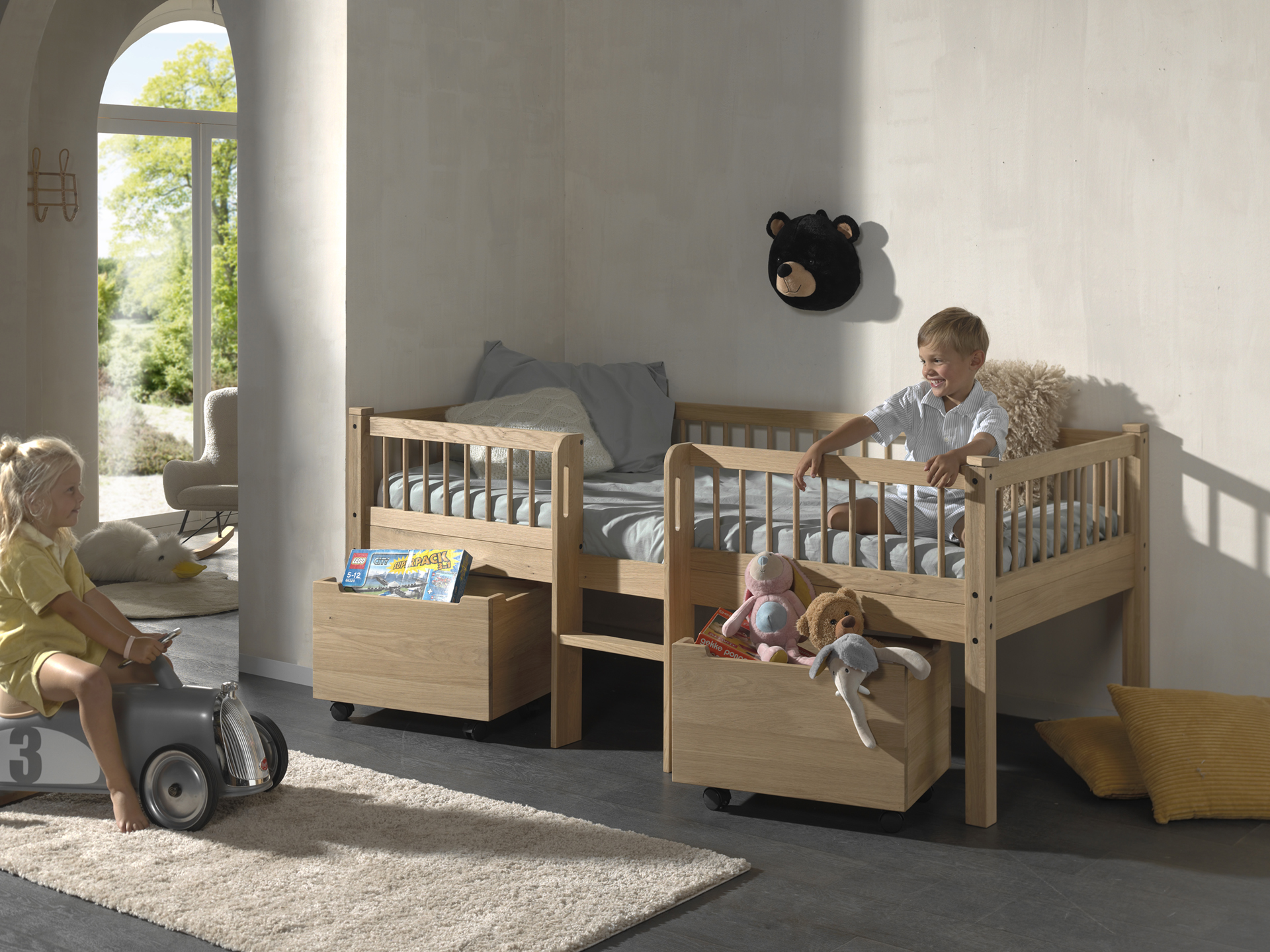 Es besteht aus 2 großen Roll-Containern und schafft Ordnung im Kinderzimmer.
