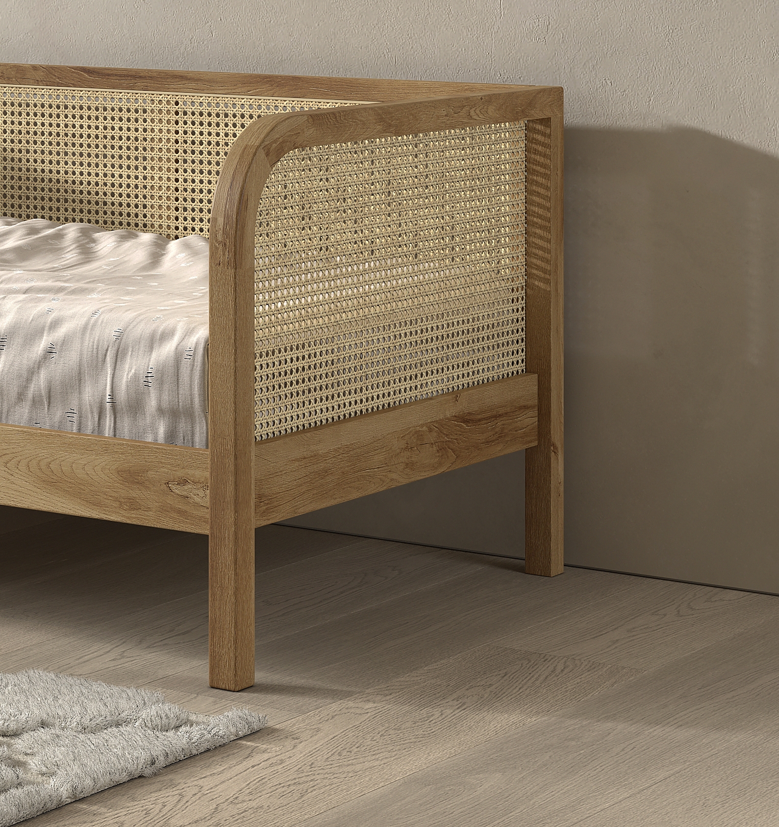 Das Rattan-Kopfteil hat eine Füllung im Stil des Wiener Geflechts.