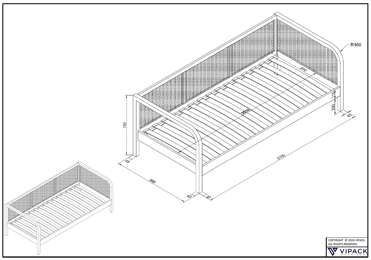 Die Seitenteile sind nach vorne gerundet und die eckigen Füße (45 x 45 mm) verleihen dem Bett eine gute Standfestigkeit.