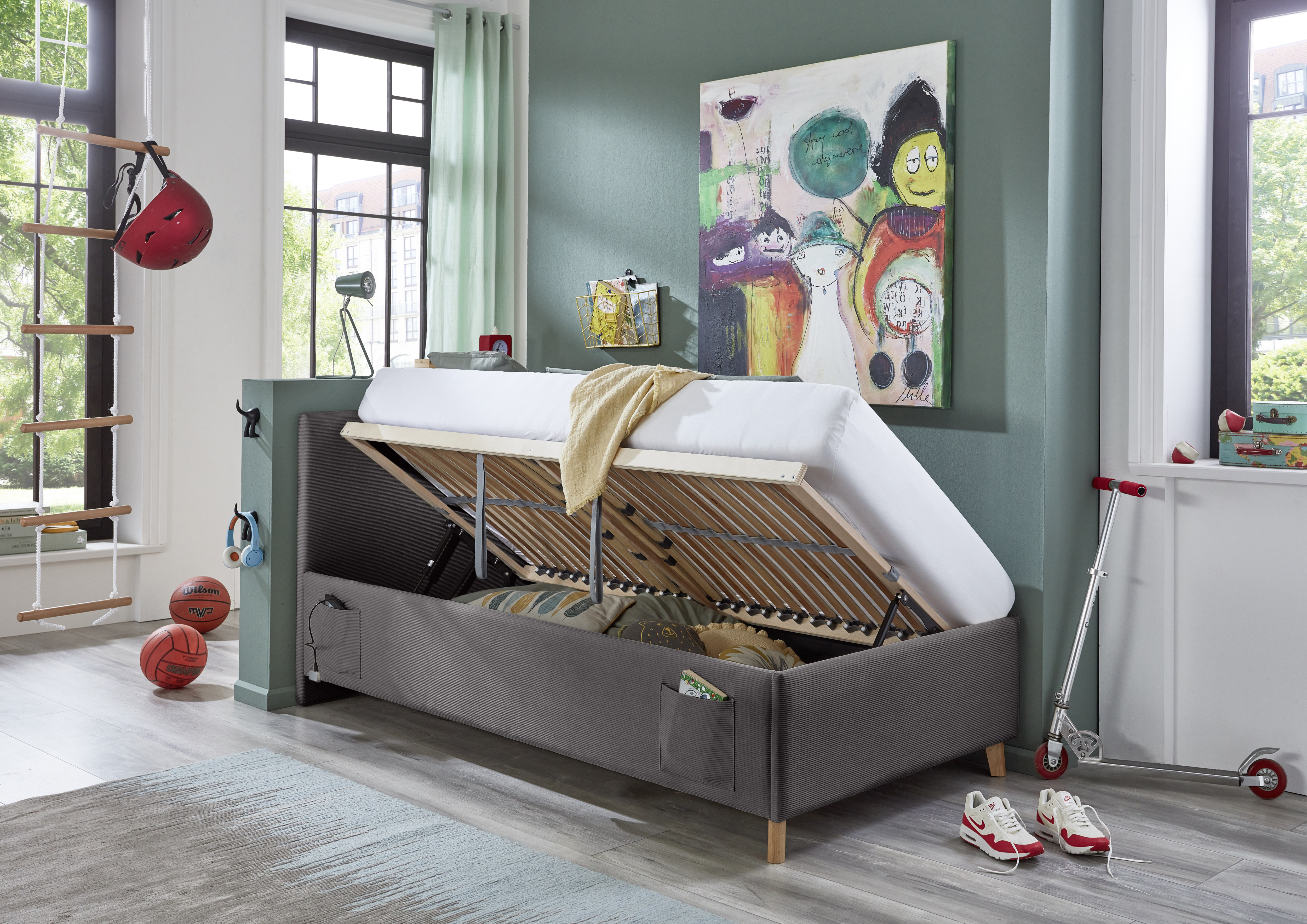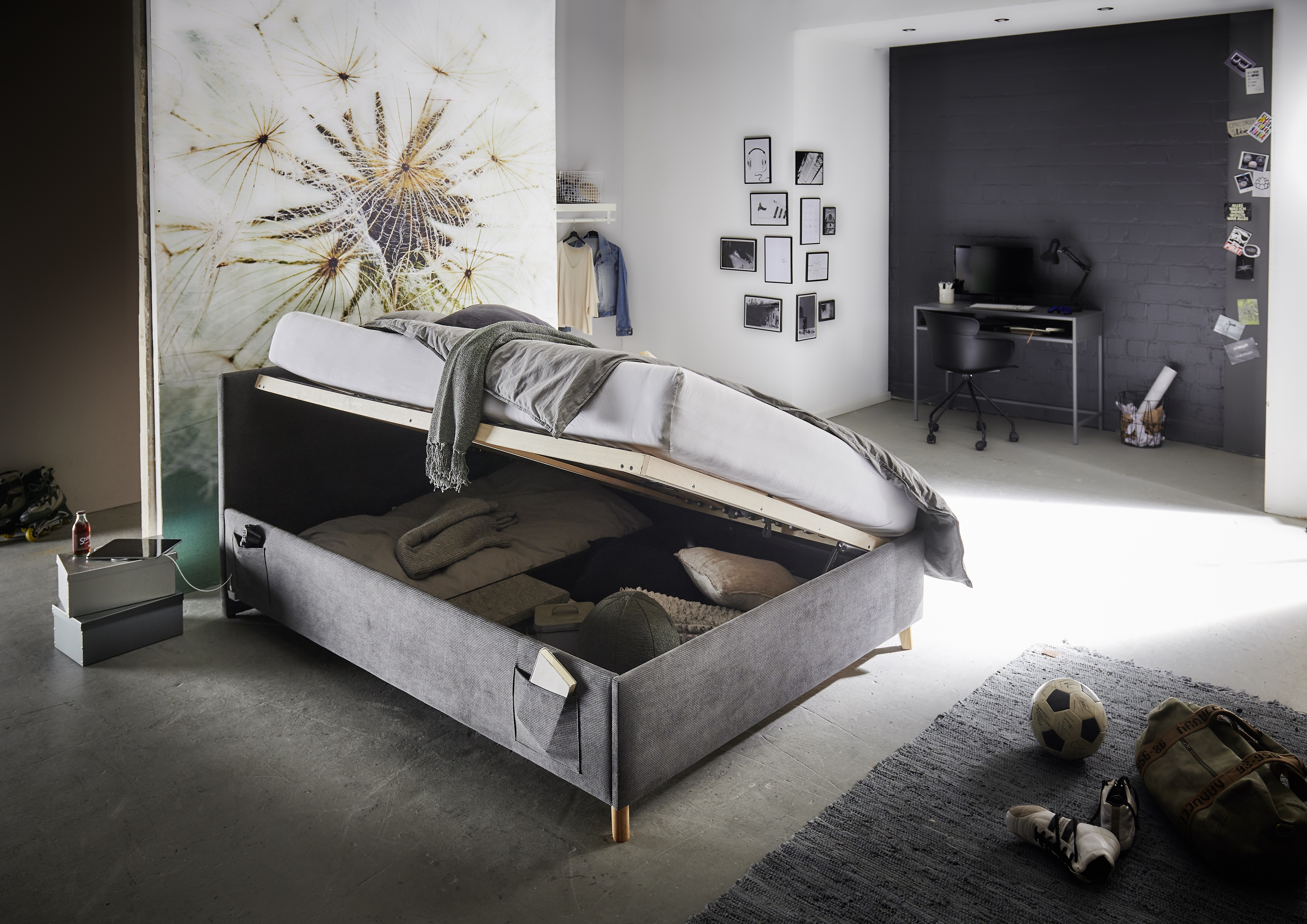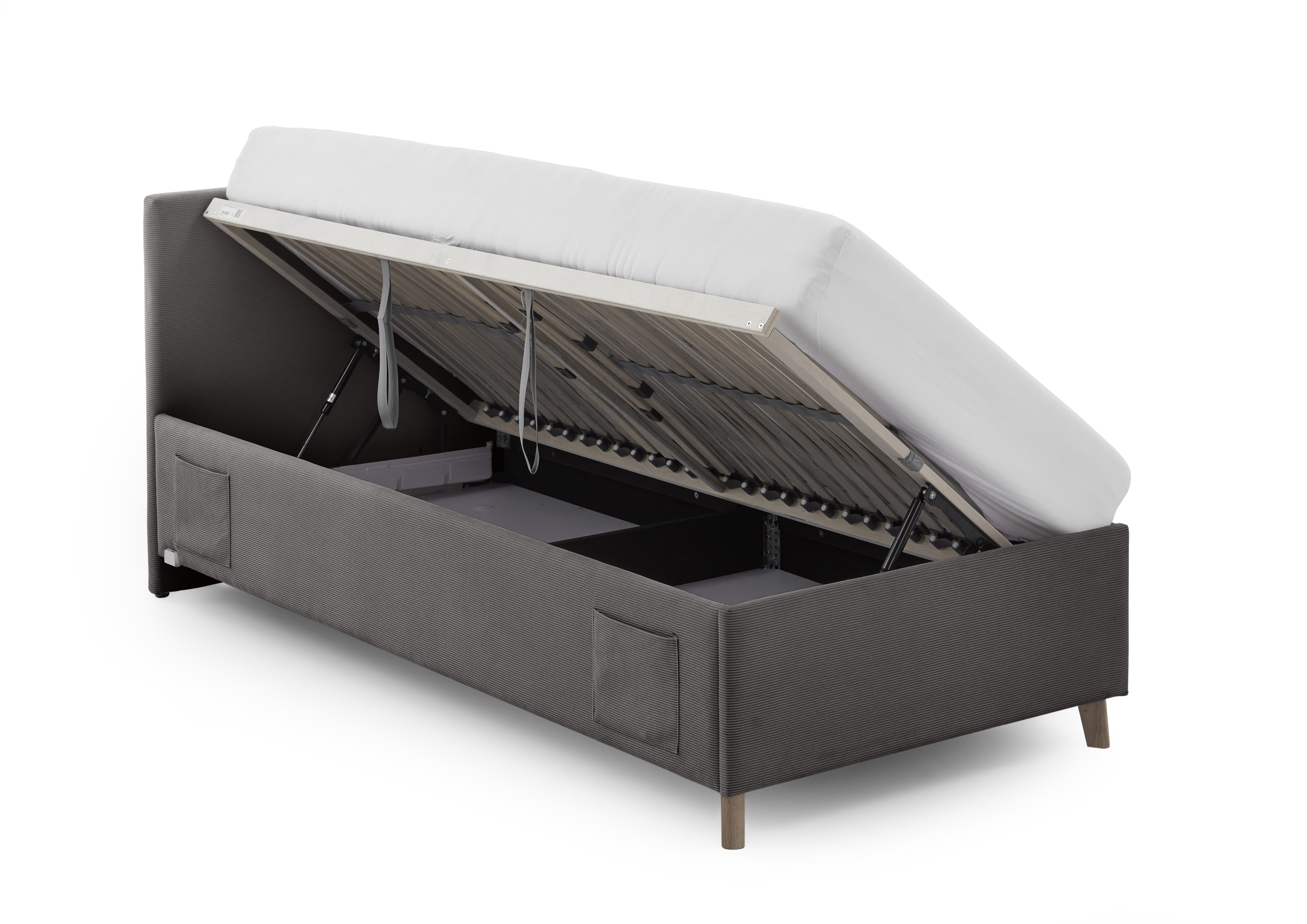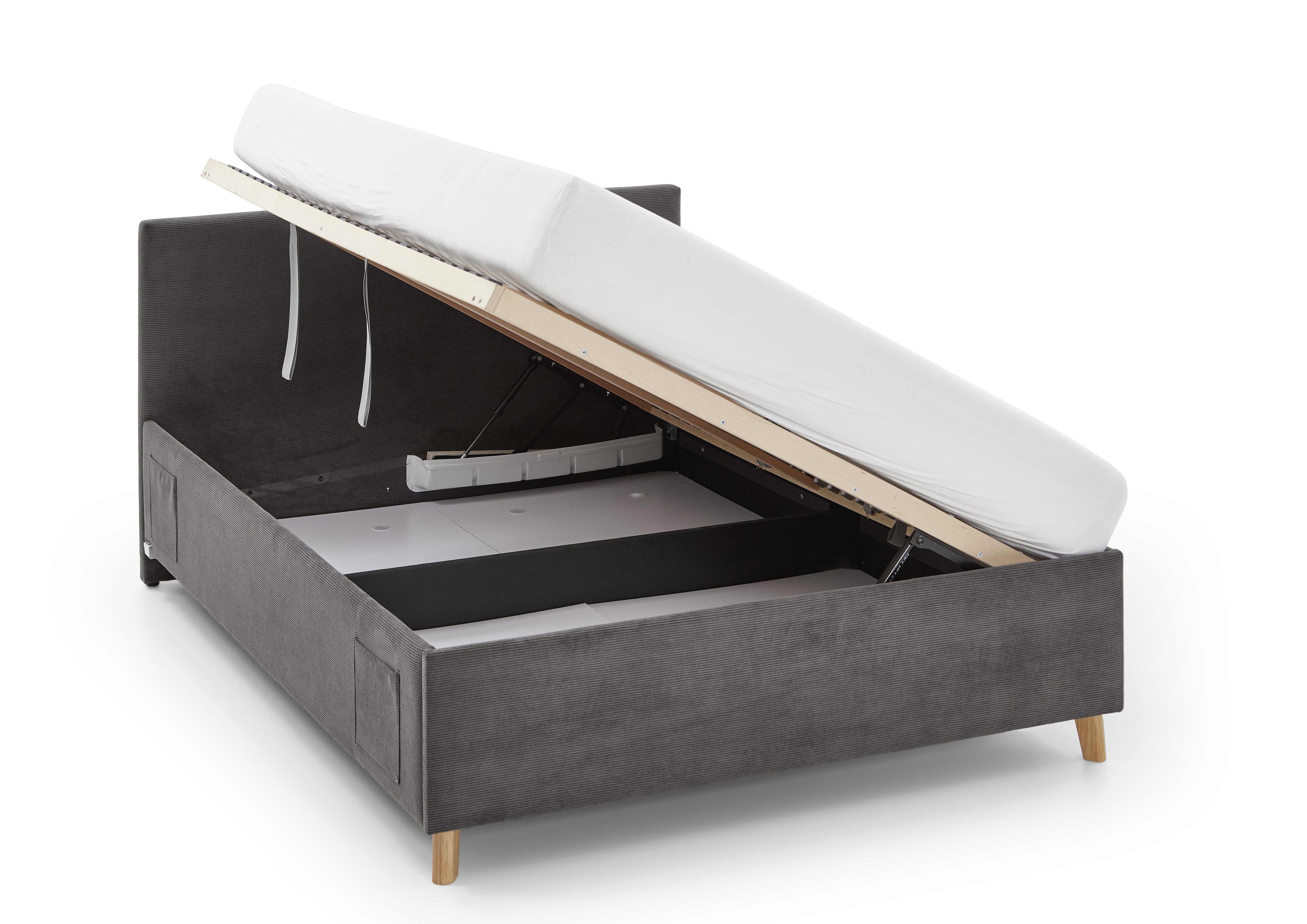 mit belüftetem Bettkasten und seitlich aufklappbarem Federholzrahmen