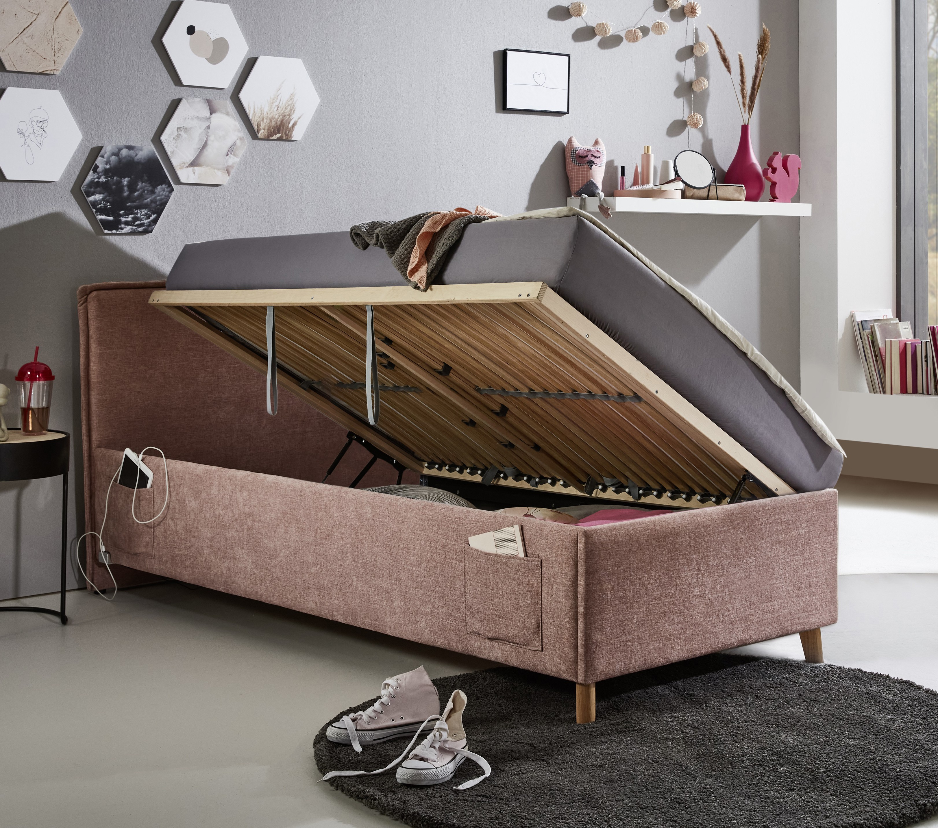 mit belüftetem Bettkasten und seitlich aufklappbarem Federholzrahmen