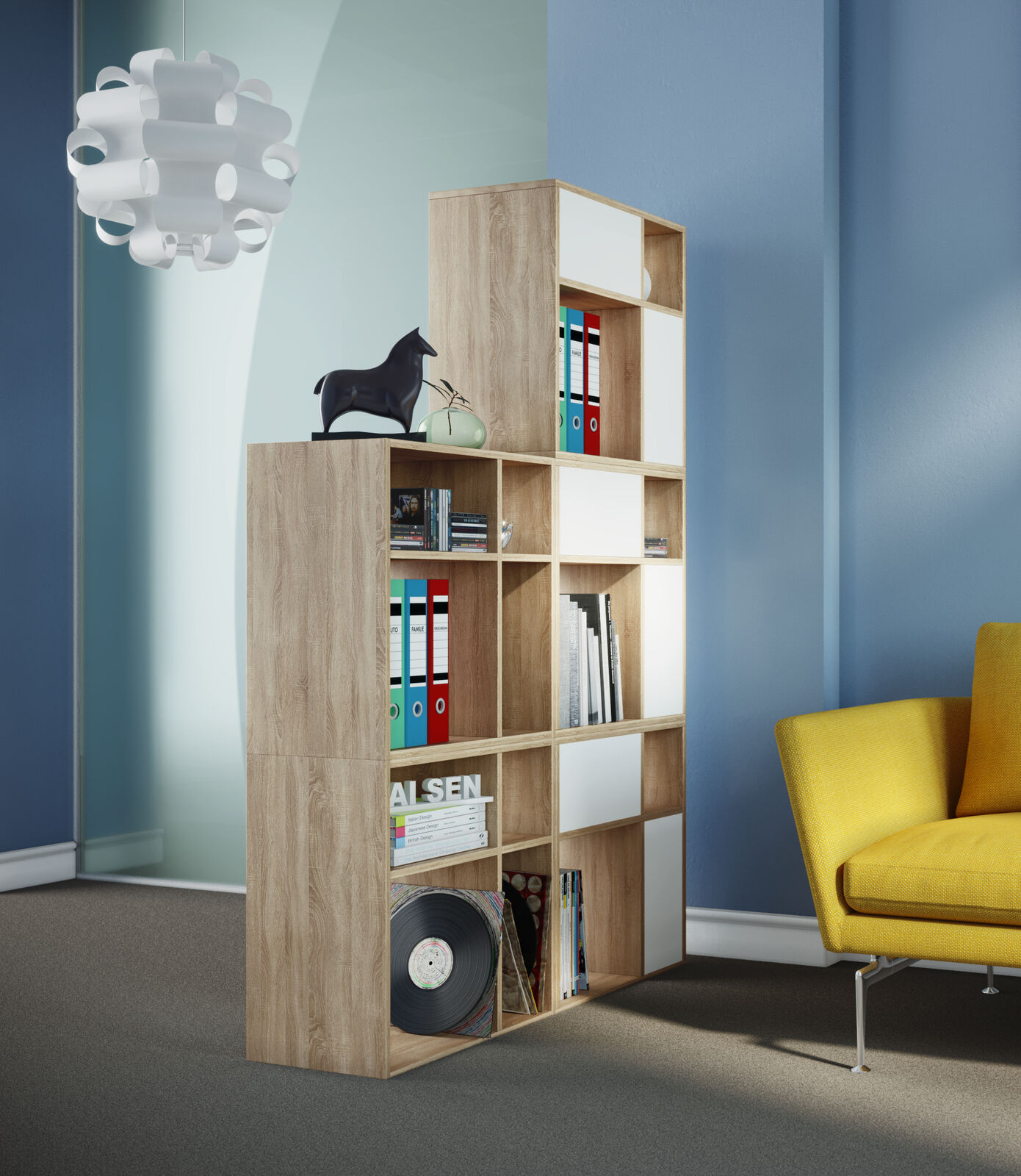 Durch die Kombinationsvielfalt eignet es sich als Raumteiler, Lowboard oder sogar als kleine Wohnwand.