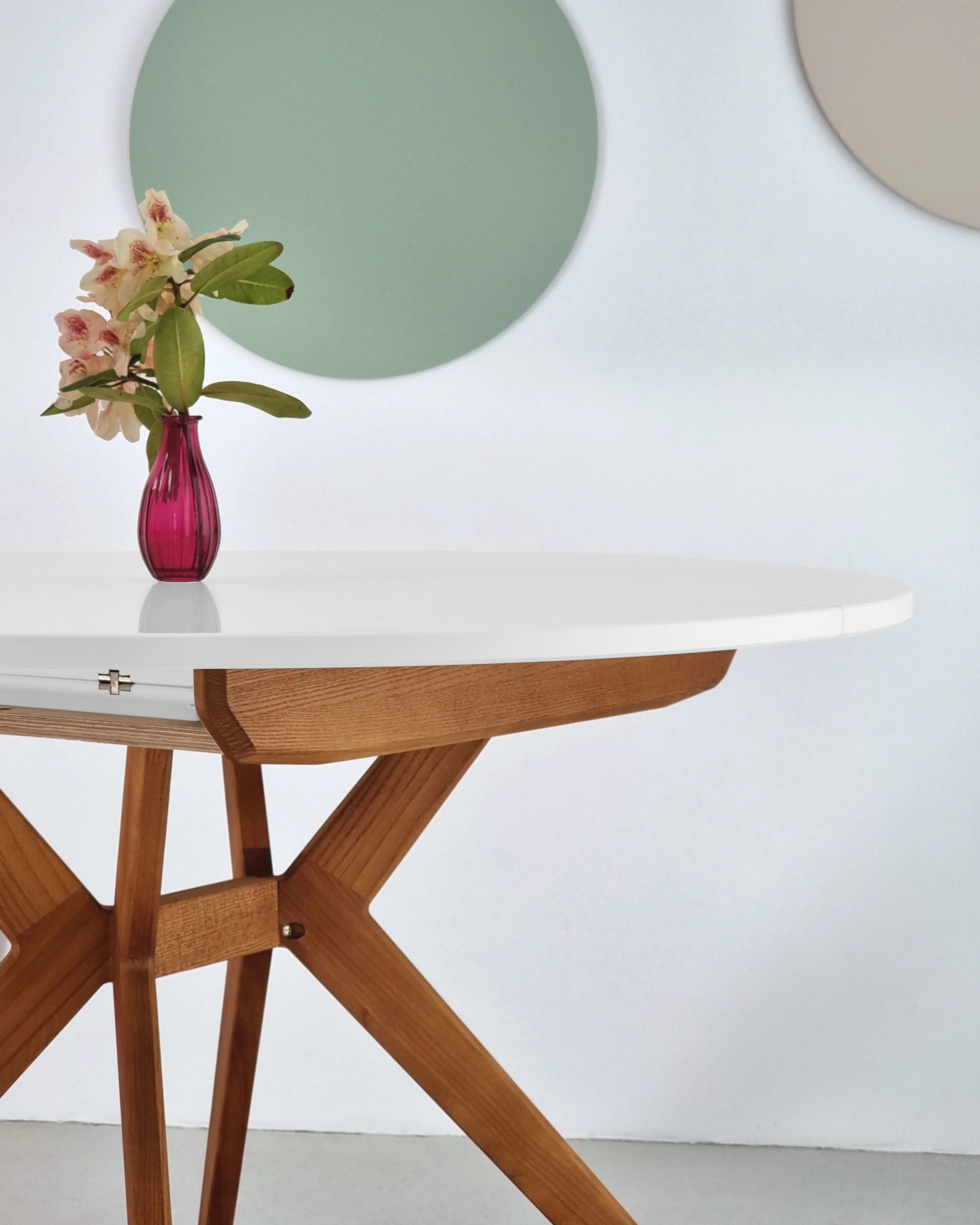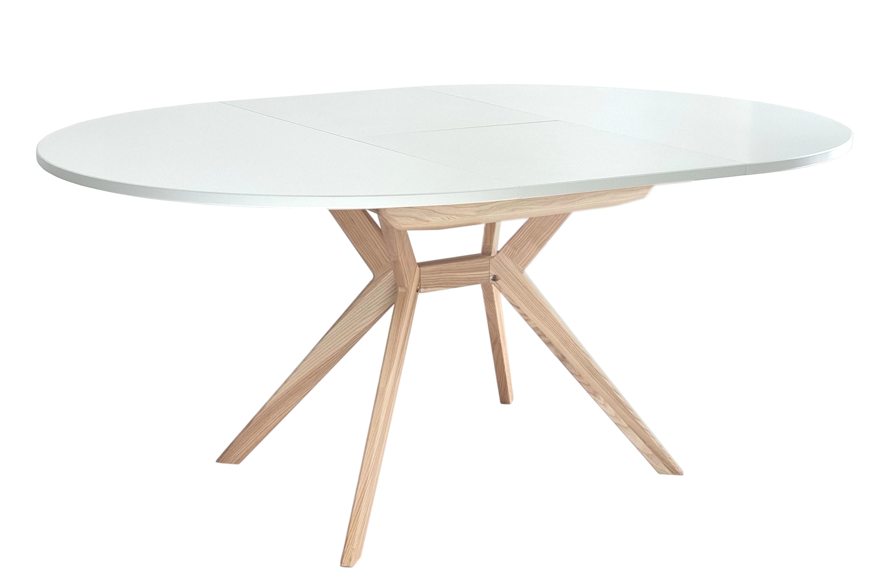 Der runde Esstisch Biju kann problemlos in einen ovalen Esstisch umgewandelt werden.