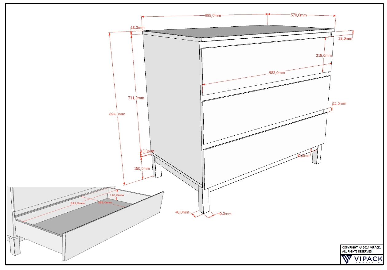 Die Füße sind aus massiver Kiefer, die Korpusteile und Schubladen sind aus hochwertigem MDF.