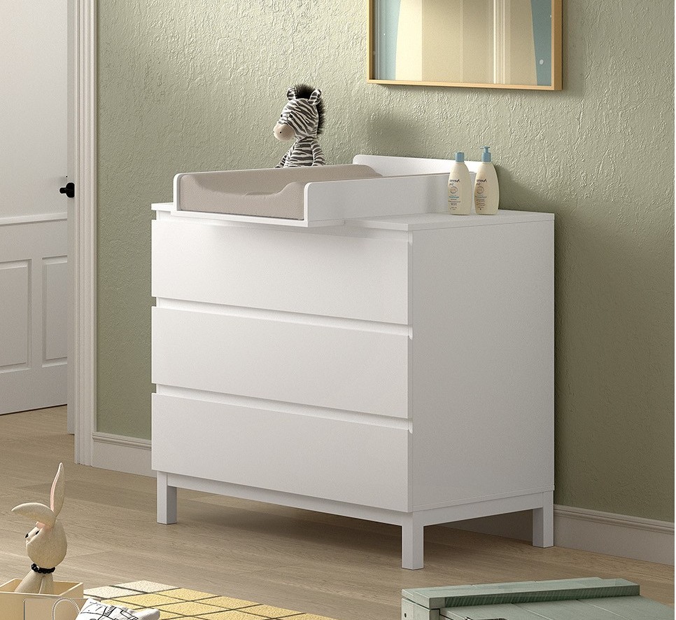 Der Wickelaufsatz gehört zum Lieferumfang und ist aus Kiefer, weiß lackiert.
