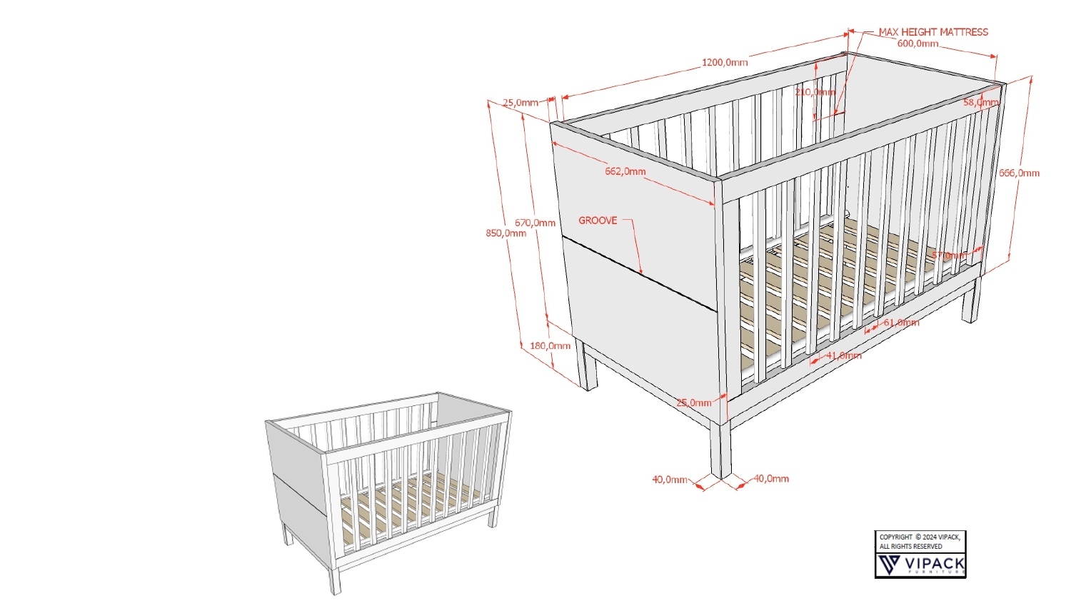 Zum Set gehört auch das Babybett mit Liegefläche in 60 x 120 cm und einem 3-fach höhenverstellbarem Lattenrost (mit 11 Leisten).