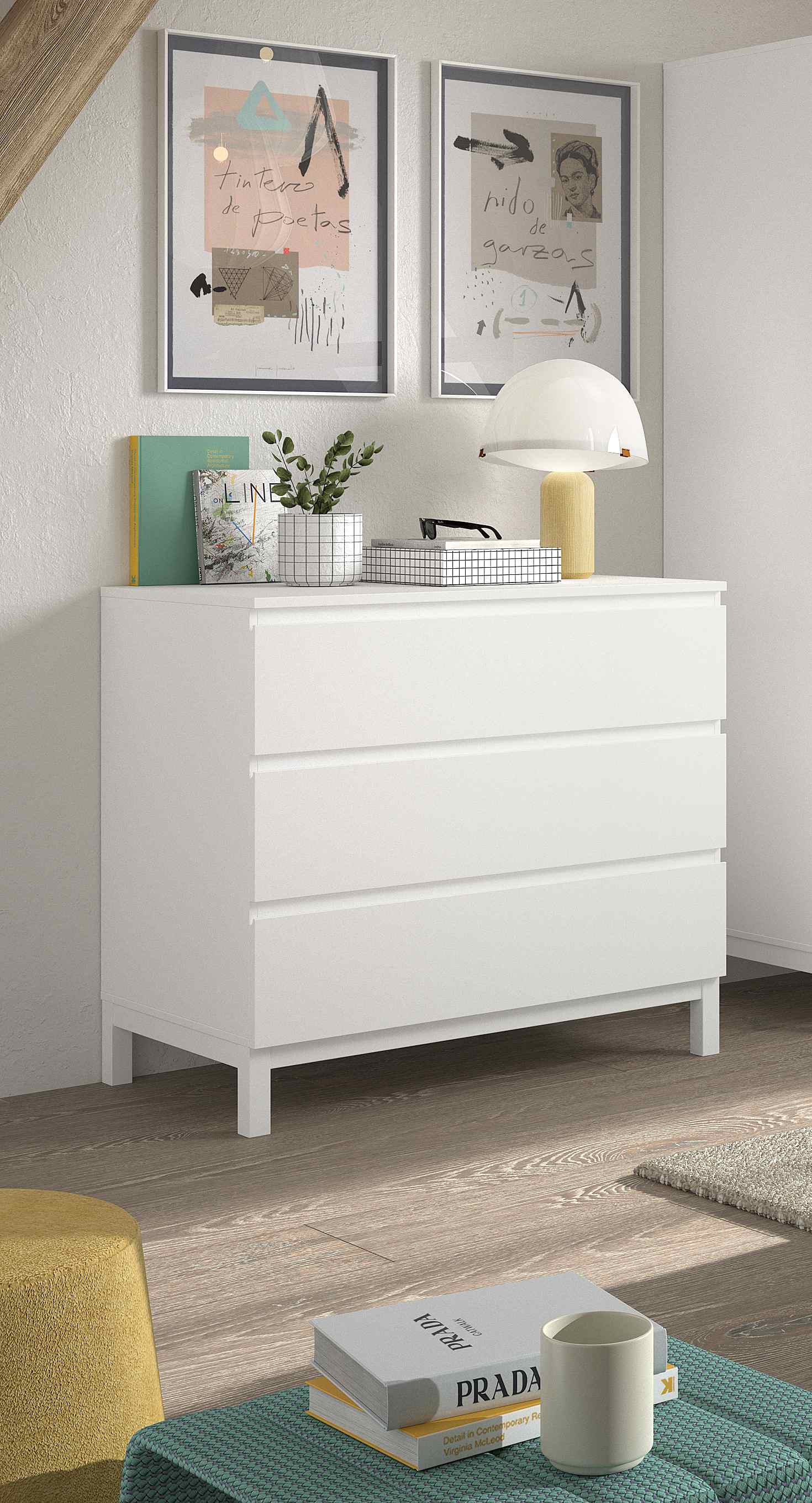Die Kommode hat 3 große Schubladen (Innenmaß ca. B: 91,1 x H: 11,6 x T: 38,5 cm) auf Metallauszug mit Soft-Close.