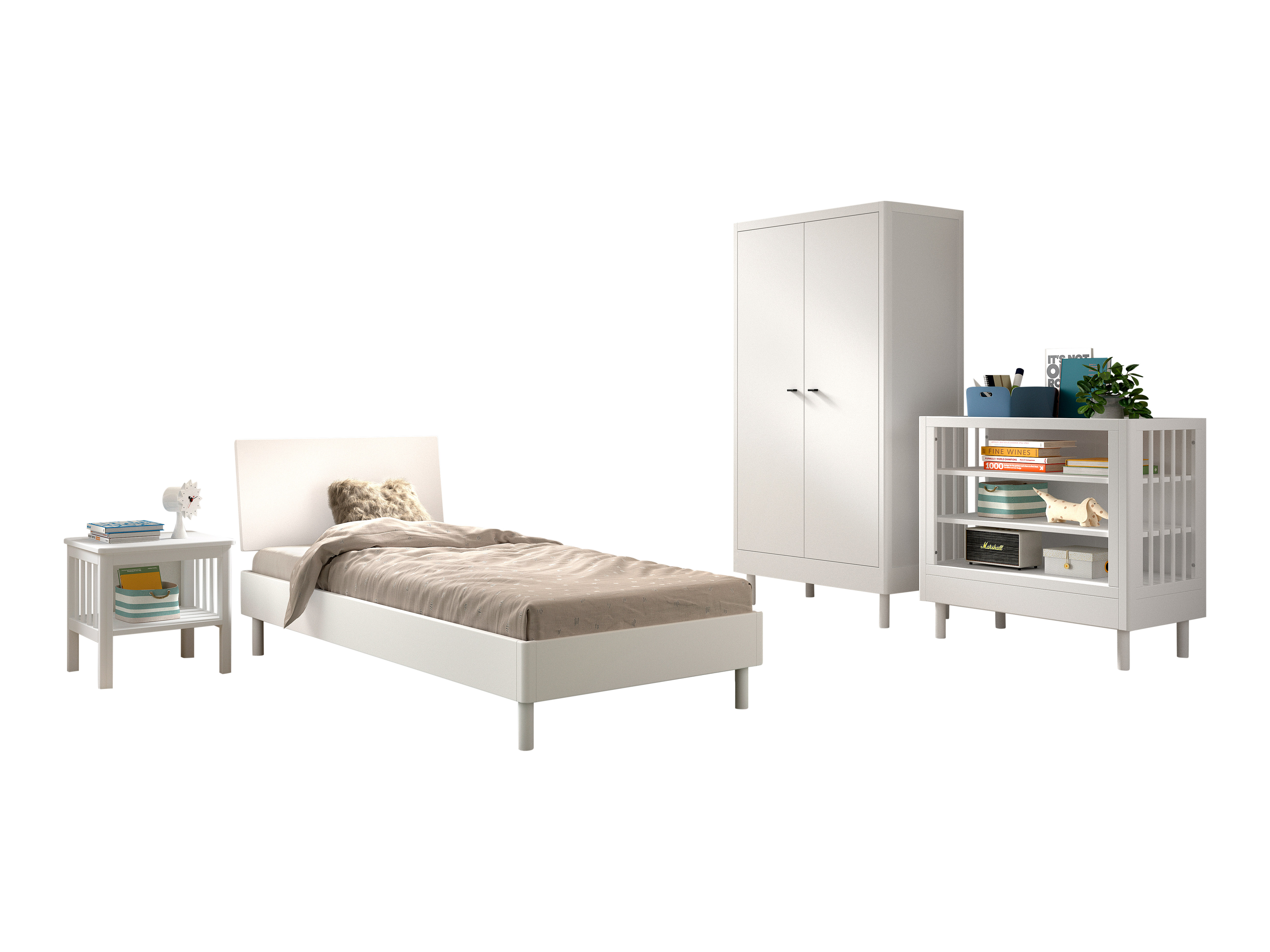 FORREST Buche Artikel Set, best. aus: Einzelbett mit Liegefläche 90 x 200 cm, Nachtkonsole, 2-trg. Kleiderschrank und Beistellregal mit 3 Ebenen.