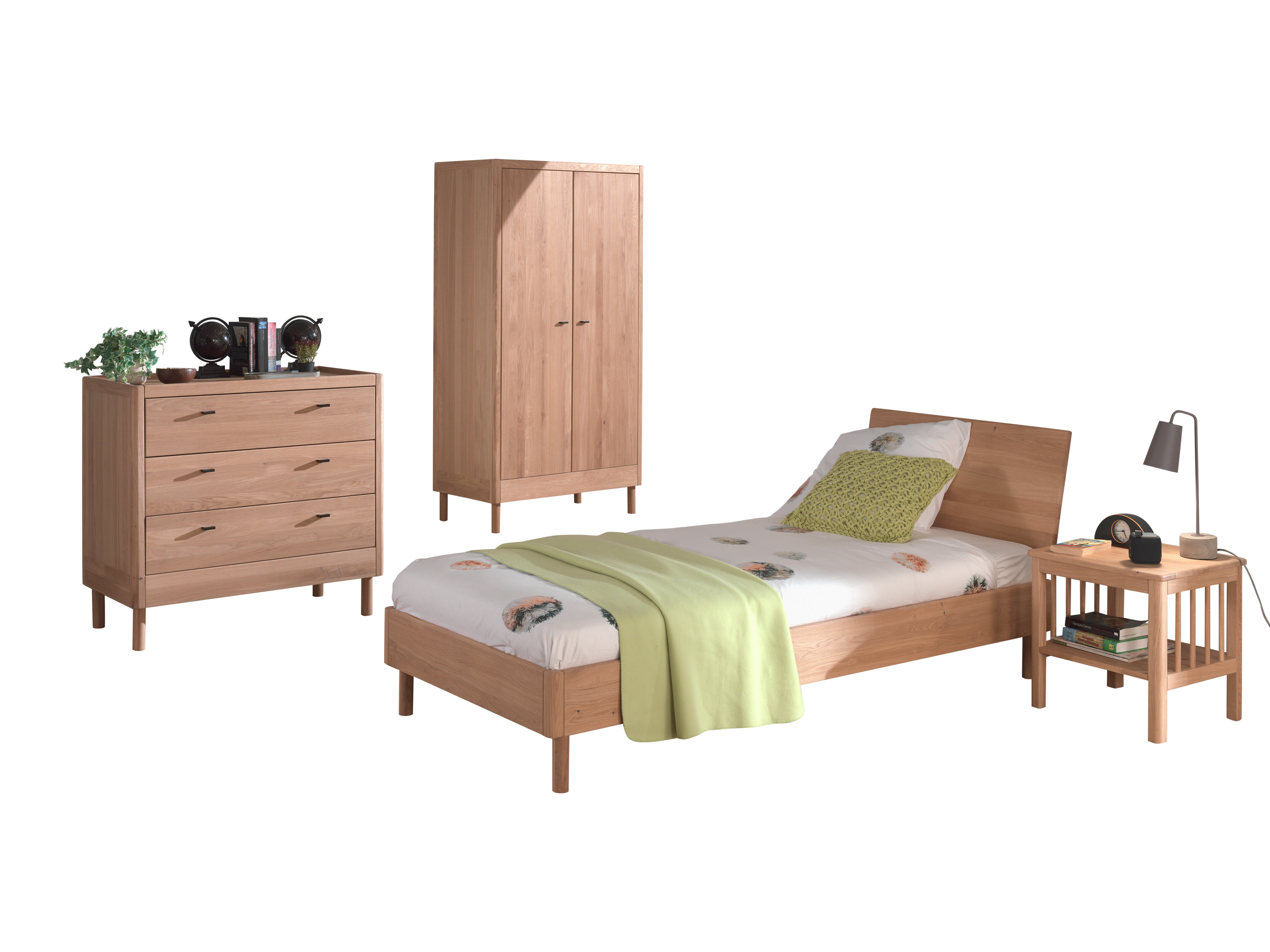 FORREST Eiche Artikel Set, best. aus: Einzelbett mit Liegefläche 90 x 200 cm, Nachtkonsole, 2-trg. Kleiderschrank und Kommode mit 3 Schubladen.