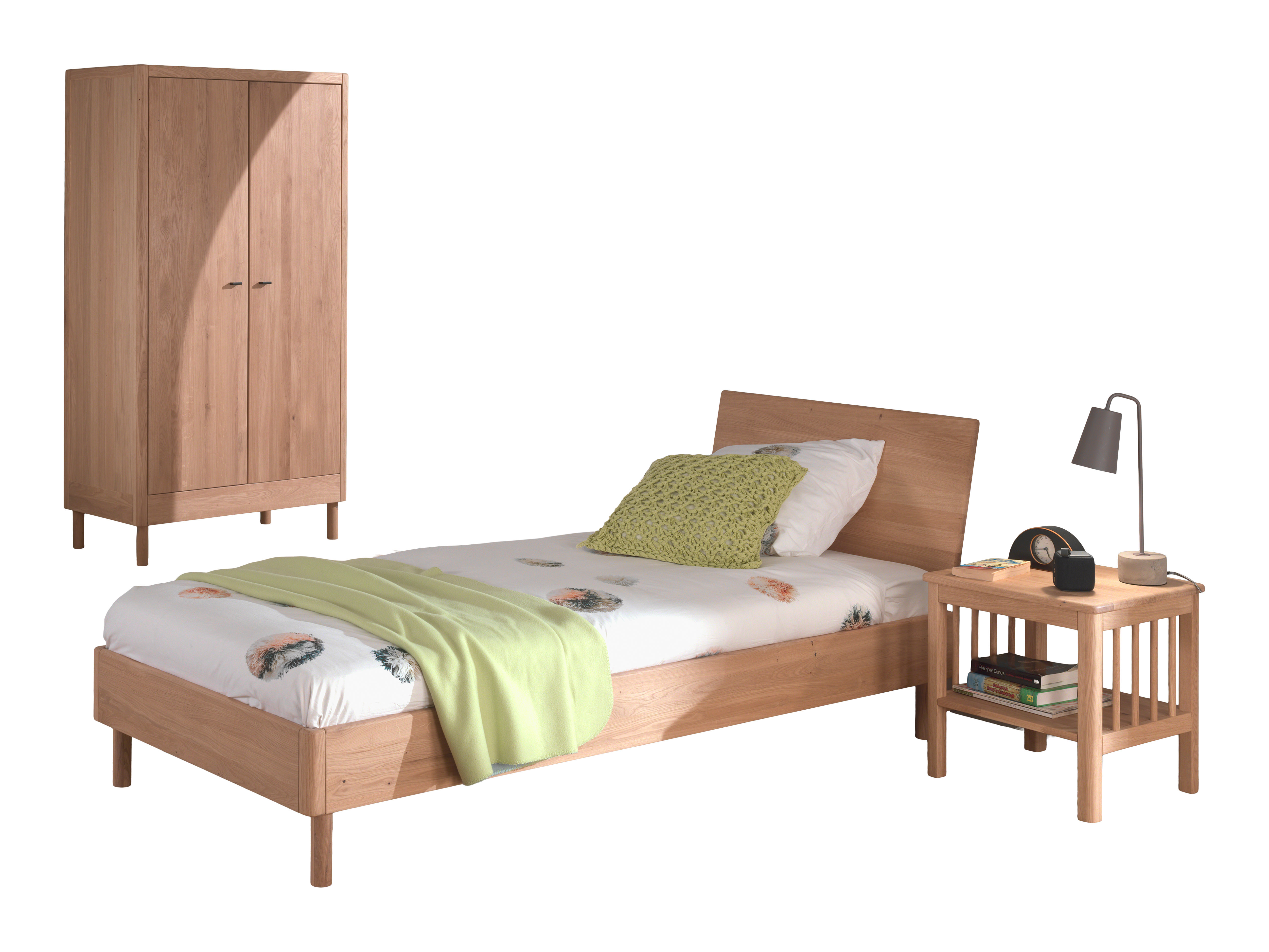 FORREST Eiche Artikel Set, bestehend aus Einzelbett mit Liegefläche 90 x 200 cm, Nachtkonsole und 2-trg. Kleiderschrank.