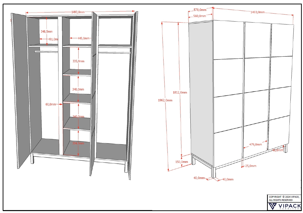 Stellfläche Kleiderschrank 3-trg. ca.: B: 149,3 x H: 196,2 x T: 57,8 cm.