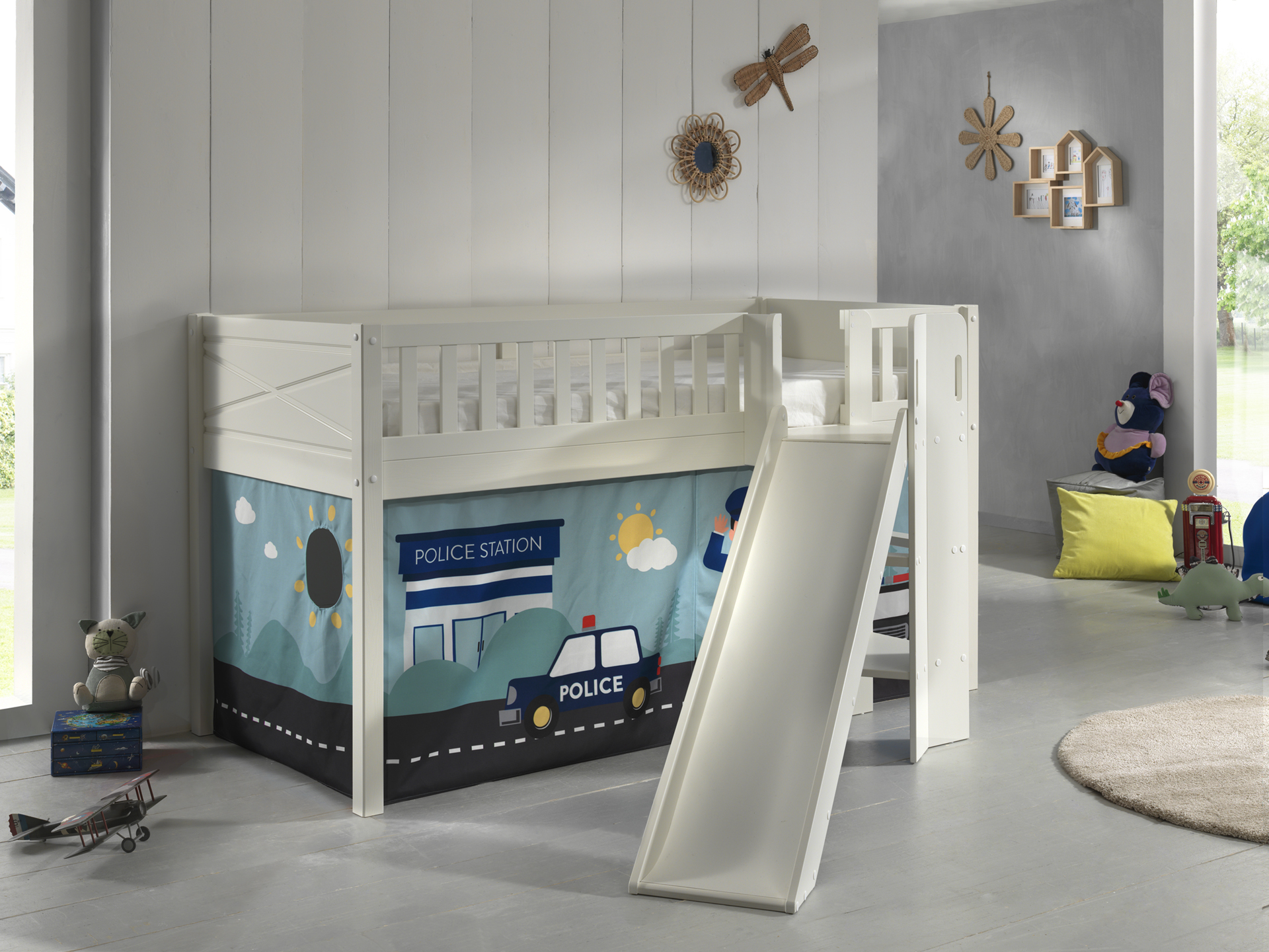 Das halbhohe Bett aus der Serie Scott, mit Rutsche und einer Liegefläche von 90 x 200 cm, ist ideal zum Spielen und Schlafen.